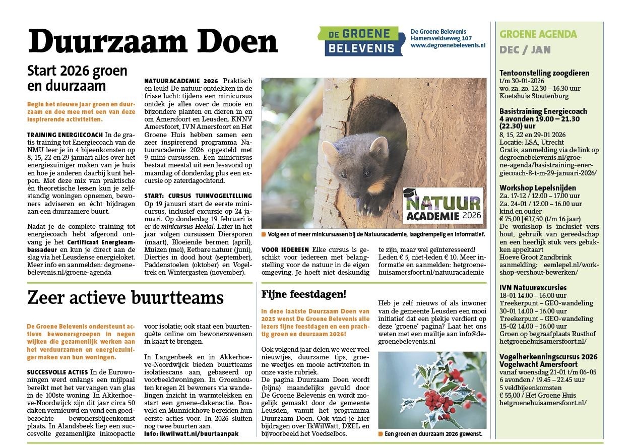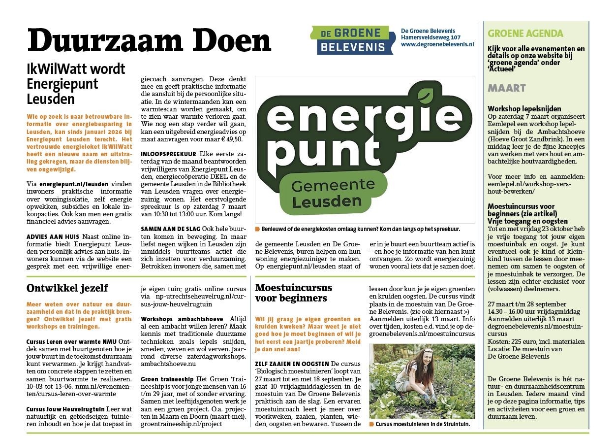 Lees hier ons nieuws! Wil je geen groene belevenis missen? Abonneer je op een van onze nieuwsbrieven. Wil je erop uit? Check de groene agenda voor activiteiten in de regio. Op zoek naar de maandelijkse Duurzaam Doen pagina uit de Leusder Krant? Klik hier voor de meest recente editie of bekijk het archief. Blijf op de hoogte Nieuws Bekijk al het nieuws van De Groene Belevenis. Lees meer Nieuwsbrief Meld je aan voor één van onze nieuwsbrieven. Meld je aan Groene Agenda Bekijk in deze Groene Agenda alles wat er bij ons en in de regio te beleven is. Bekijk de agenda
